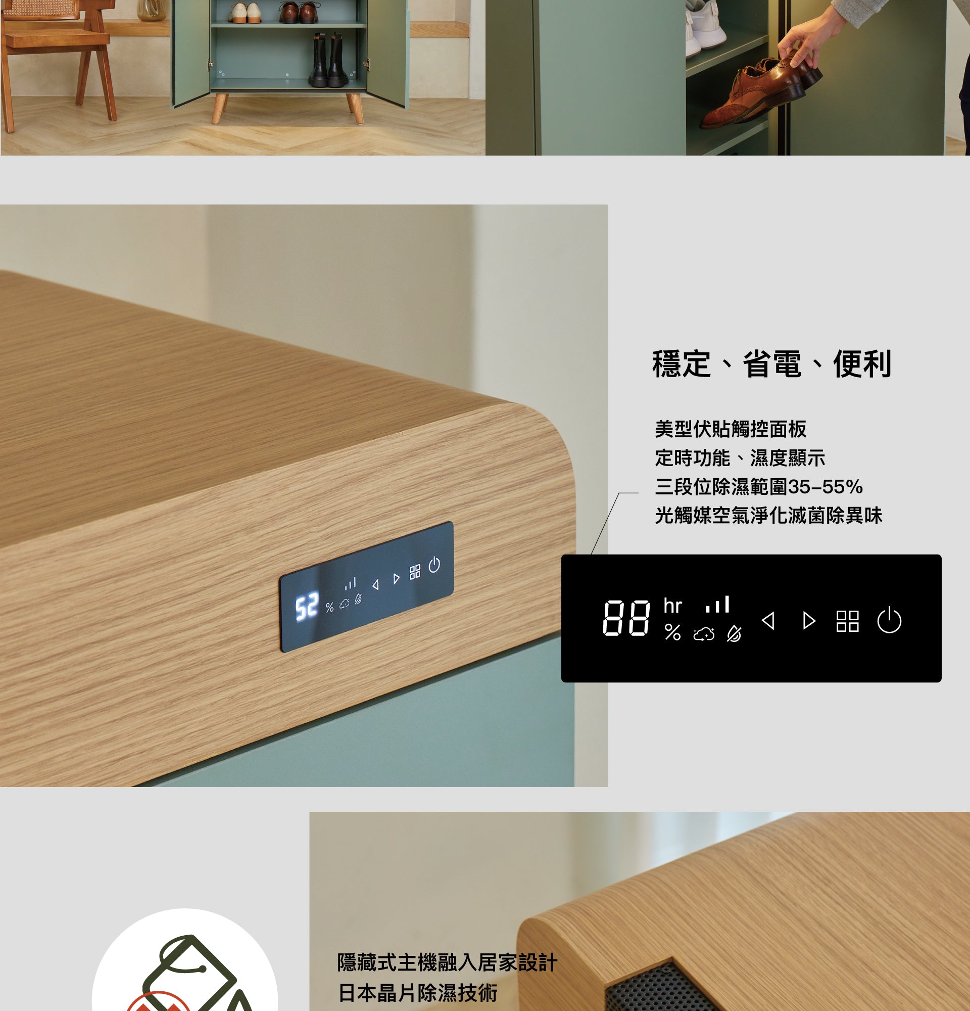 功能設定:三段式除濕設定,光觸媒滅菌設定,定時設定。
